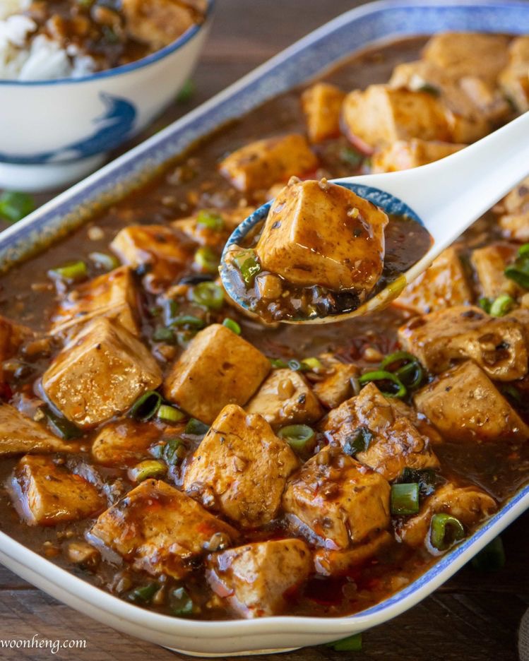 Đậu Hũ Tứ Xuyên, phiên âm Mapo Tofu, hay còn gọi là đậu hũ Ma Bà. Nguồn gốc của món ăn này khởi nguồn từ một quán ăn nhỏ thế kỷ 19 – Đồng Trị, ở Tứ Xuyên. Chủ quán là bà Chen mặt rỗ, nên người dân xung quanh gọi bà là Chen Mapo (bà Chen có bộ mặt rỗ). Bà Chen trong một lần thấy trong kho còn dư khá nhiều đậu hũ non, nên mới nghĩ ra món để làm với đậu hũ non cho hết số đậu này. Do Tứ Xuyên nổi tiếng là ẩm thực có nhiều loại ớt, tiêu đem lại nhiều vị cay tê khác nhau, nên bà Chen mới lấy thịt lợn băm nhuyễn, trộn với xì dầu, hồ tiêu, xuyên tiêu, đem xào thành loại nước sốt thịt, trộn với đậu hũ non và tạo thành món Mapo Tofu, chính xác là Chen Mapo Tofu – Món đậu hũ của bà Chen mặt rỗ.