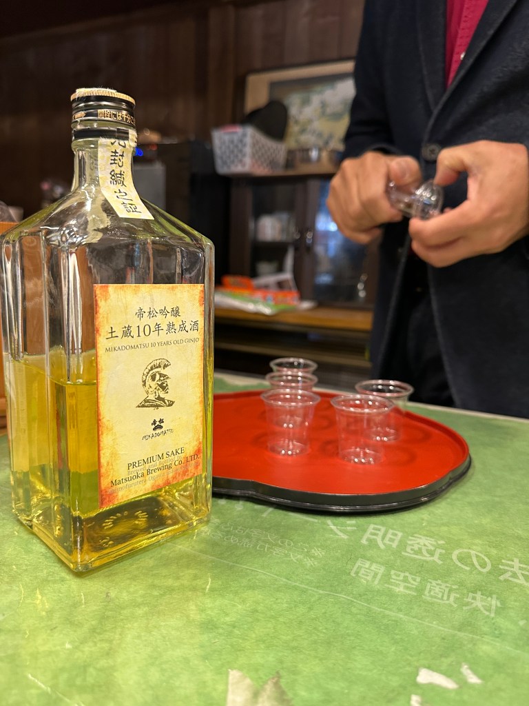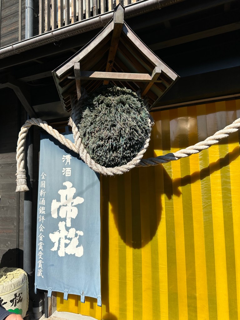 Ngay cửa vào khu xưởng, có một quả cầu bằng lá thông, được quấn quanh bởi một sợi dây thừng màu trắng, to. Hỏi ra mới biết, đây là cách truyền thống để biết được loại rượu Sake đặc biệt có thể uống được. Khi làm mẻ Sake vào 8-9, quả cầu bằng lá thông xanh, đến khi toàn bộ ngả sang nâu, thì mẻ rượu đó đến điểm ngon nhất để uống.