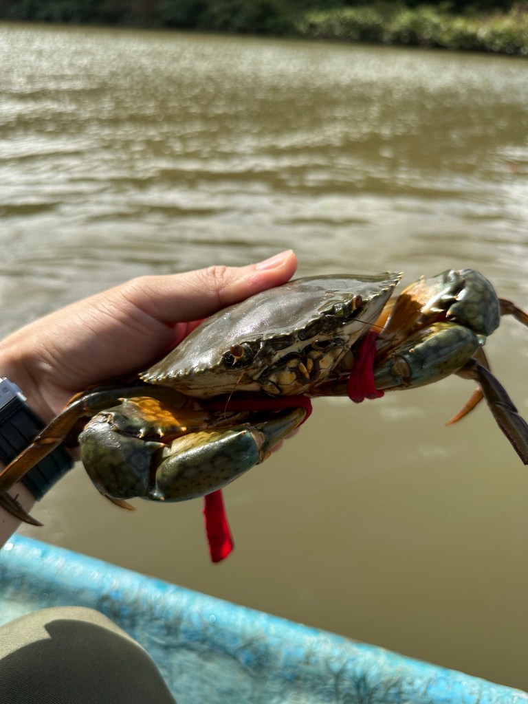 Đến vuông, được trải nghiệm đi xuồng ba lá, để thăm các lồng bẫy cua. Lồng bẫy mắt cáo, có lỗ chui vào, lưới bọc xung quanh, cho mồi là 1 con cá nhỏ. Những con cua trưởng thành sẽ đủ sức vào ăn và kẹt trong đó. Thăm từng lồng, nếu cua đủ kích thước sẽ lấy, còn không sẽ thả lại. Nếu lấy cua, thì thả lồng tiếp để bẫy tiếp. Thường 1 lồng thì chỉ có 1 hoặc 2 con cua mỗi lần. Nên 1 vuông lớn sẽ thả từ 60-100 lồng, 1 ngày thăm lồng 3 lần để thu hoạch.