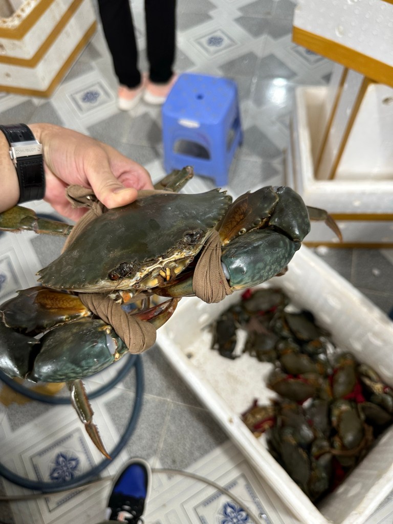 Con trai ông Hai Chiến, chủ vựa cua Dư Thái Bình nhiệt tình và cởi mở như đặc trưng người miền Tây, vừa bắt cua, vừa giải thích cho tôi về cách phân biệt cua đực – cái, gạch – thịt, và các kích thước của cua khi mua bán, và nhận biết chất lượng đạt hay không. Cách sờ, cách bóp, các nhìn, soi đèn cua để phân biệt. Nghe vậy thôi, chứ phải ở đây tầm vài tháng may ra mới có thể phân biệt thành thục được. Trước đây cứ nghĩ cua càng to càng ngon, nhưng qua lần này mới biết không phải như vậy. To chưa chắc ngon, mà to lại ngon thì chắc chắn đắt, mà cũng chưa chắc đắt bằng loại nhỏ nhưng phân loại VIP.
