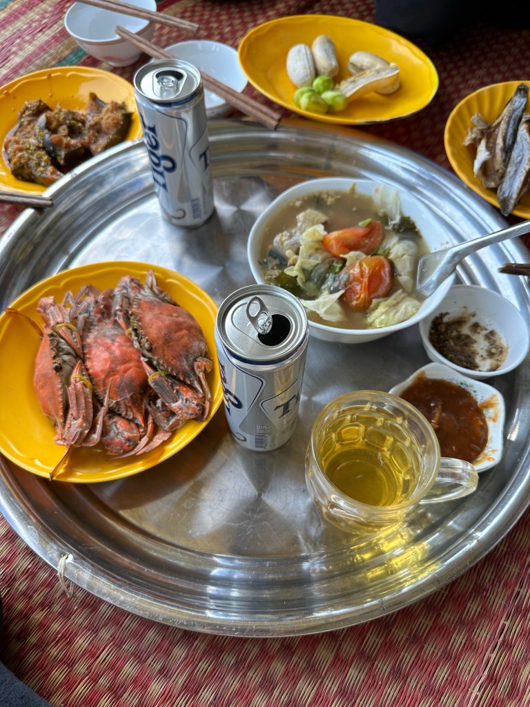 Tôi còn được mời đến nhà người thân của 1 anh đi cùng, không có gì ngoài 11 hecta vuông thả cua, tôm. Vợ chồng chú Út Mót, nuôi 3 con học ở Sài Gòn, bây giờ đã có nhà ở Quận 2 nhờ vào vuông cua. Ngồi đằng sau nhà, sát mép nước, cá ngát kho, vọp hấp, đều được vớt tại vuông. Uống bia với chuối nướng, cóc non. Gió mát rượi, nếu không phải di chuyển thì cứ thể nhậu rồi ngủ tới tối. Bảo sao nhậu miền Tây, người ta có thể ngồi từ sáng đến chiều hôm sau.