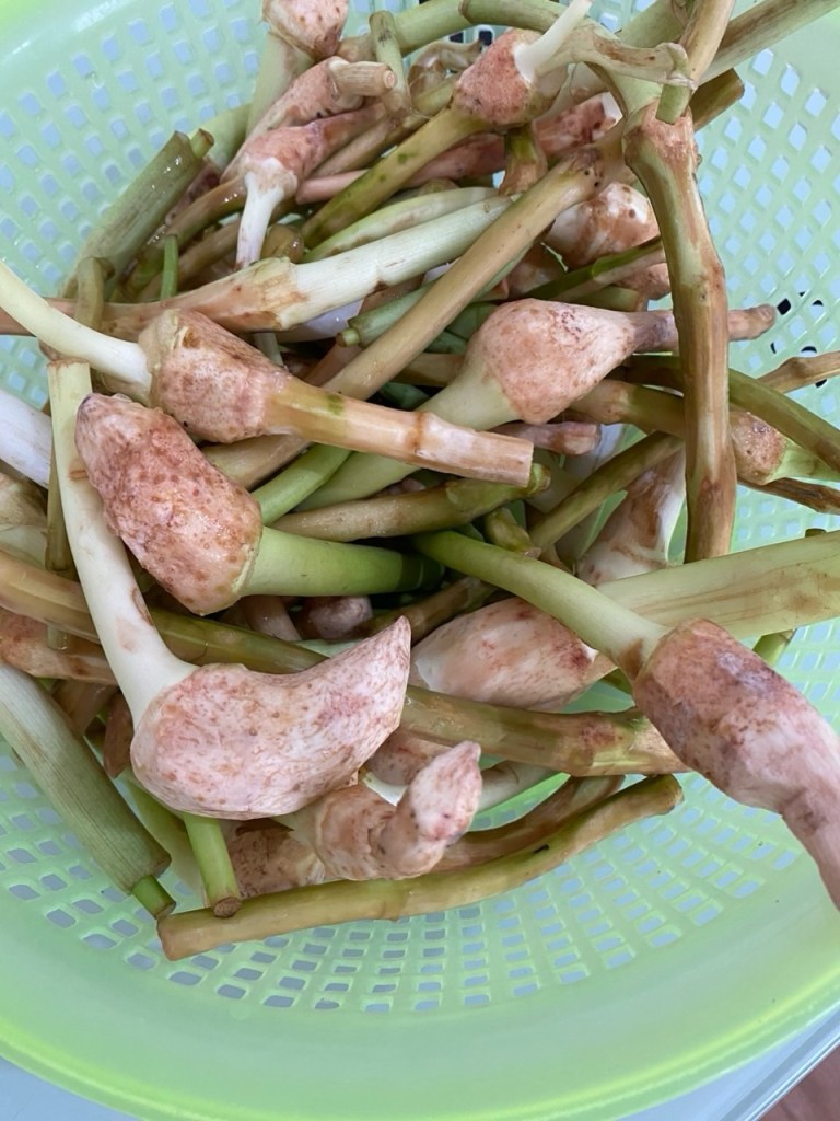 Lâu lắm, tôi mới được thưởng thức lại món Canh dãi khoai. Dãi khoai, hay ngó, bồng khoai là phần mọc từ gốc của cây khoai môn hay khoai ngứa. Dãi khoai mọc thân dài, có dãi còn có cả củ khoai non. Có cậu em Rể, quê ở Thái Bình, mỗi lần về quê, cô sui đều gửi quà lên, và có dãi khoai. Nói thật, mẹ và các bác tôi nhận dãi khoai còn háo hức như nhận được cao lương. Các siêu thị ở Hà Nội chắc không có bán, các chợ dân sinh may ra có, tôi cũng không rõ nữa.